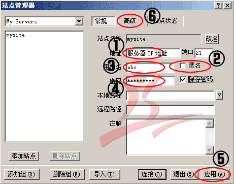 3.点击“确定”后,出现以下界面。在1处输入您的站点地址(如:abc.com),将2处“匿名”前的选勾去掉,在3处输入FTP用户名(如:abc),在4处输入FTP密码(将保存密码前的选勾打上),点击5处 “应用”按钮;