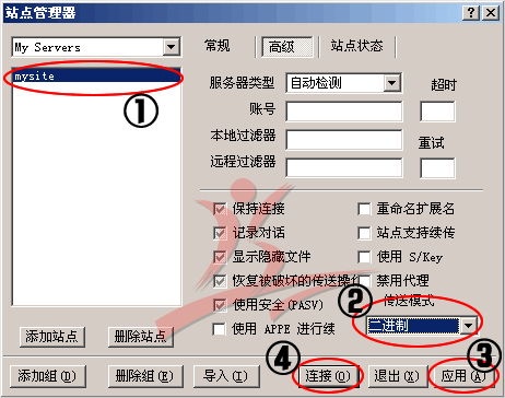 4.点击上图 6 处, 切换到“高级”标签(如下图)。 在1处选中刚建立的站点名称(mysite),在2处的“传送模式”选择二进制,点击3处“应用”。至此您的FTP站点已经建立成功;